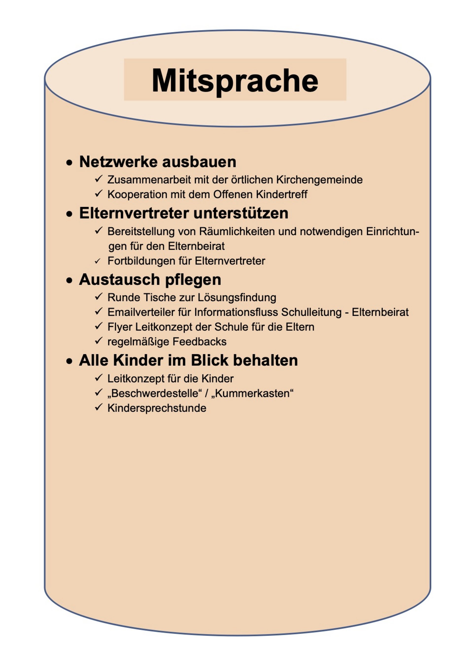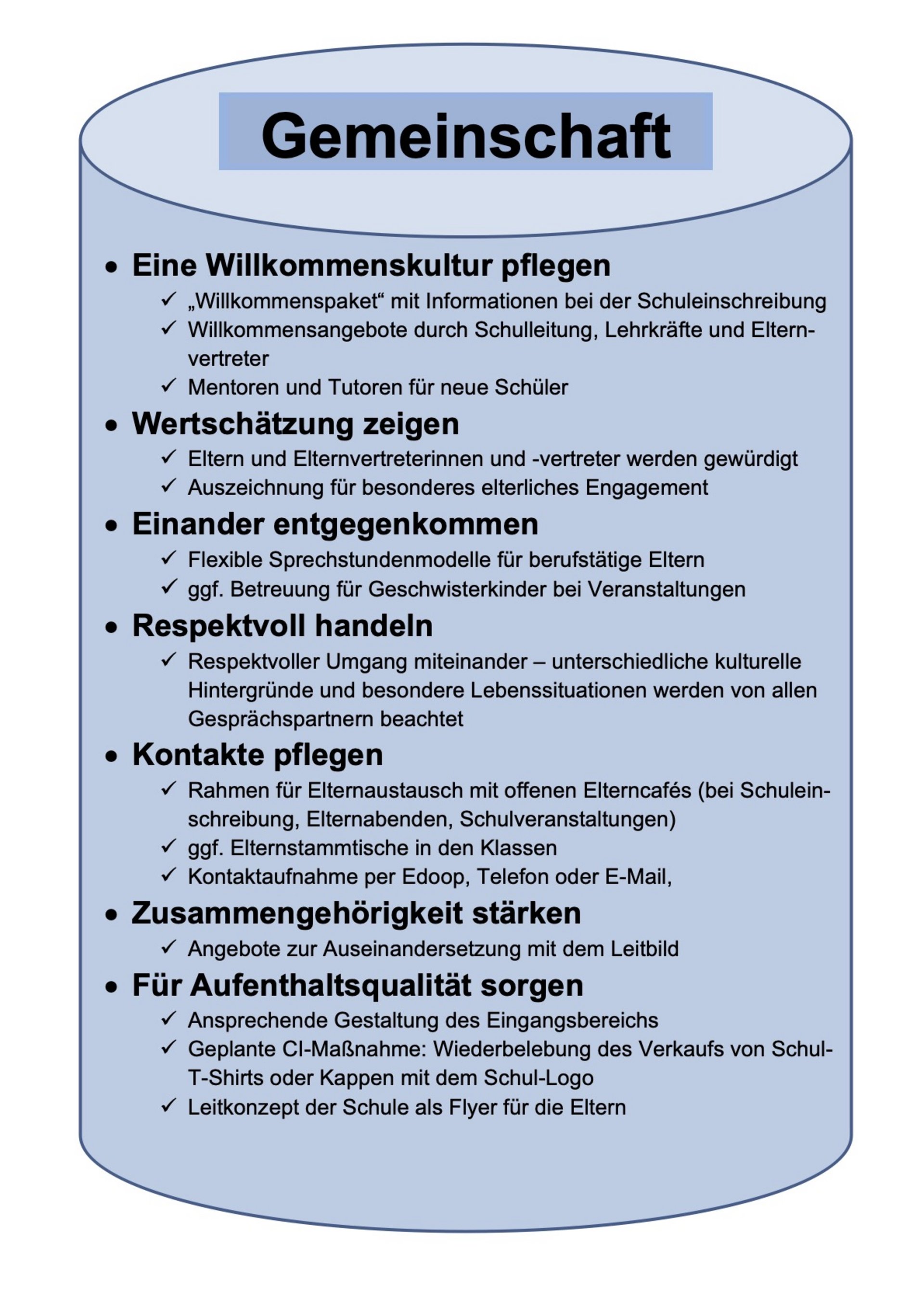 Wir wünschen uns, dass wir unsere Vielfalt als Chance sehen und diese für eine gemeinsame Weiterentwicklung und Stärkung der Partnerschaft Schule - Elternhaus nutzen. Wie jede Partnerschaft benötigt dies Zeit, Bereitschaft und Engagement aller Beteiligten. Wie unser Leitbild der Schule, in uns dem wir zu einem verantwortungsvollen, freundlichen und wertschätzenden Umgang untereinander bekennen, so sollen uns auch diese facettenreichen Leitlinien als ein Instrument dienen, den Partnerschaftsgedanken stets im Auge zu behalten. Wir freuen uns auf eine weiterhin fruchtbare und gute Zusammenarbeit zwischen Elternhaus und Schule.