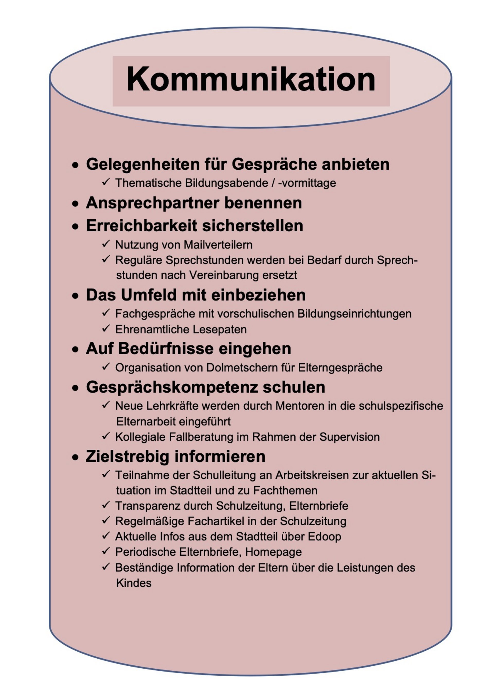 Begriffe wie „Schulfamilie“ oder „Bildungs- und Erziehungspartnerschaft“ begegnen uns häufig, ohne dass wir genau hinterfragen, was dahintersteckt, nämlich – ganz einfach – die Zusammenarbeit von Schule und Elternhaus, genauer gesagt von Schülerinnen und Schülern, Lehrkräften, Eltern sowie ggfs. auch pädagogischem Personal (Jugendsozialarbeit und Ganztagsbetreuung). All diese Personenkreise bilden eine Gemeinschaft und damit den Kern des Zusammenlebens in der Schulfamilie. Unser aller Ziel ist es, unseren Kindern eine bestmögliche Erziehung und Bildung zukommen zu lassen und wir wünschen uns, dass jedes Kind individuell gefördert und gefordert wird. Dies gelingt am besten in einer intakten Partnerschaft, in der alle – Schule und Elternhaus – an einem Strang ziehen. In der Praxis des Alltags ist das allerdings manchmal gar nicht so leicht umzusetzen, bedenkt man, wie viele unterschiedliche Persönlichkeiten, kulturelle, religiöse und soziale Hintergründe sowie Talente und Bedürfnisse unter den einzelnen Mitgliedern dieser Gemeinschaft aufeinandertreffen.